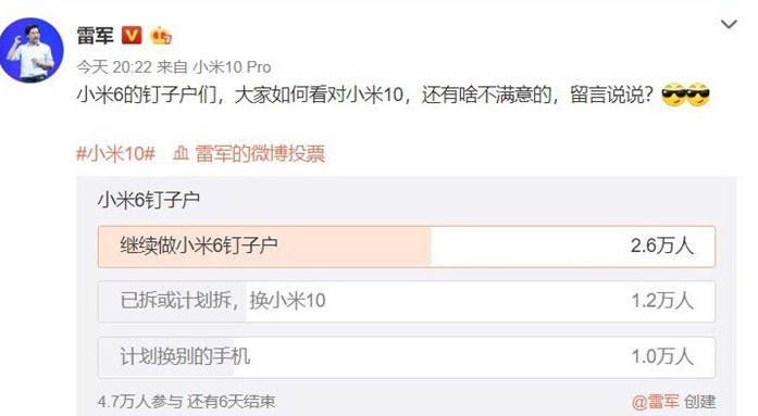 小米10发布后,它的使命除了要冲击高端商场之外,别的一个使命便是根除米6钉子户。从最开端的体现来看,的确有不少米6用户换机。可是随后从雷军的一个查询投票来看,仍旧有对折的网友表明乐意持续当钉子户。
