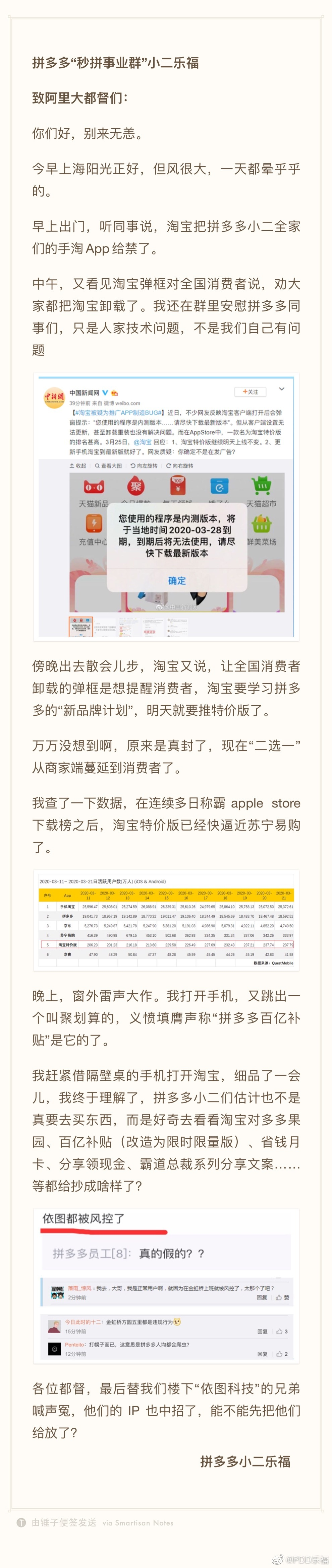 对此,ID为“PDD乐福”的拼多多“秒拼事业群”小二乐福回应称“拼多多小二们估计也不是真的要去买东西,而是好奇去看看淘宝对多多果园、百亿补贴、省钱月卡、分享领现金、霸道总裁系列分享文案等都给抄成啥样了……”回应直指淘宝“抄袭”,同时暗指淘宝的风控系统不准确,“依图员工也被风控。”